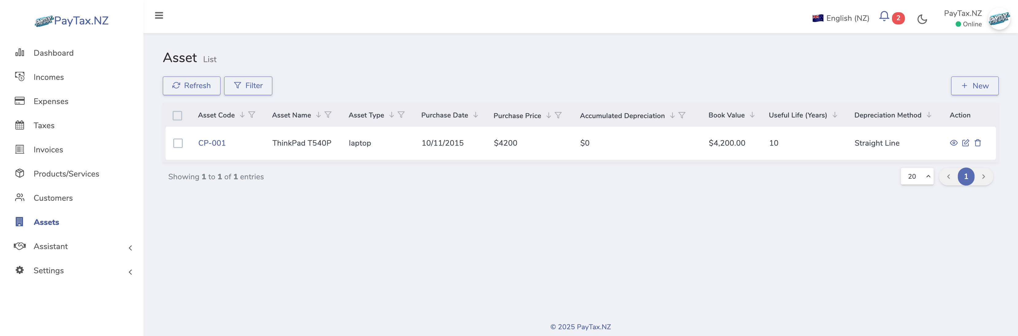 PayTax.NZ provides a comprehensive fixed asset management system that allows you to: